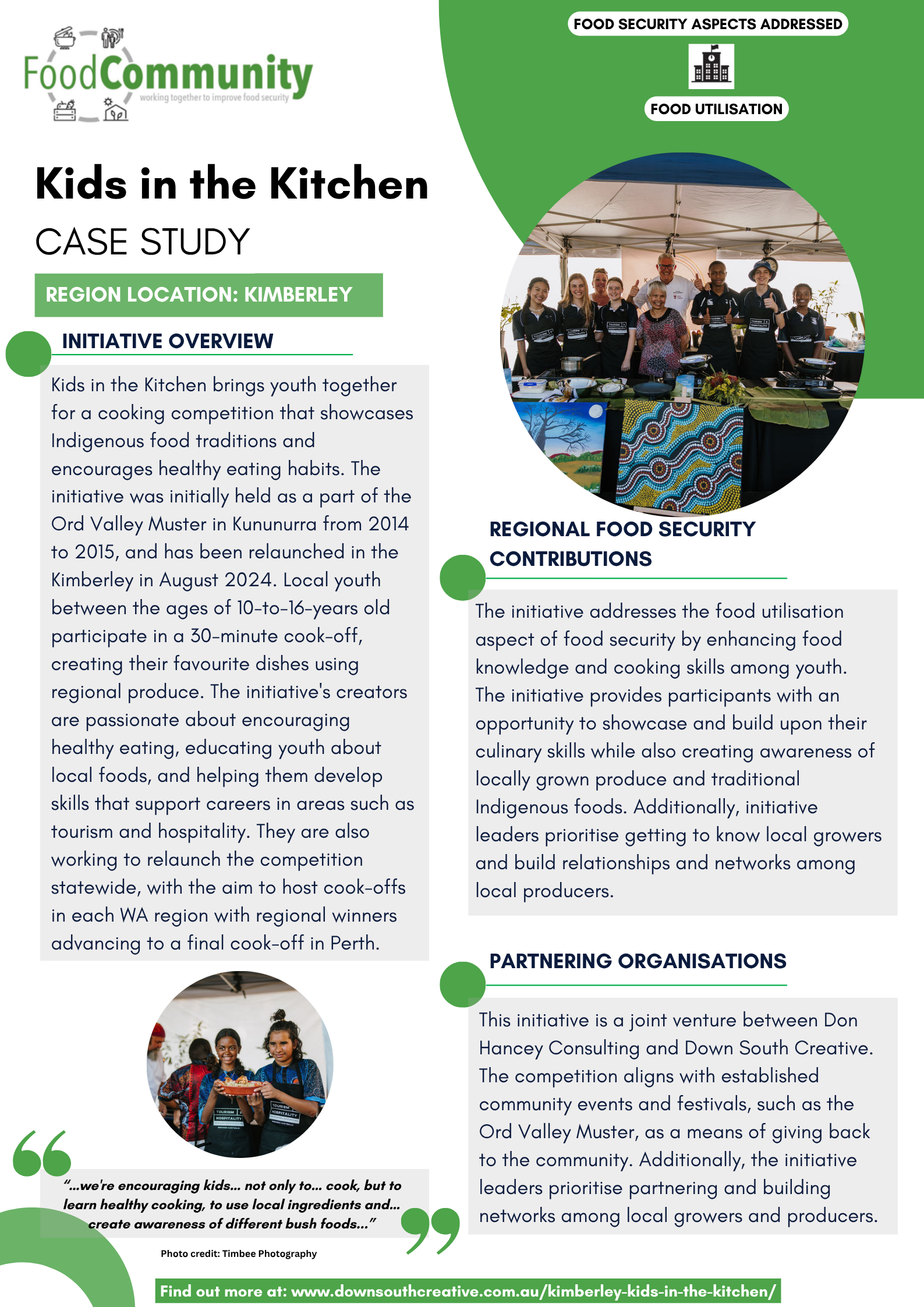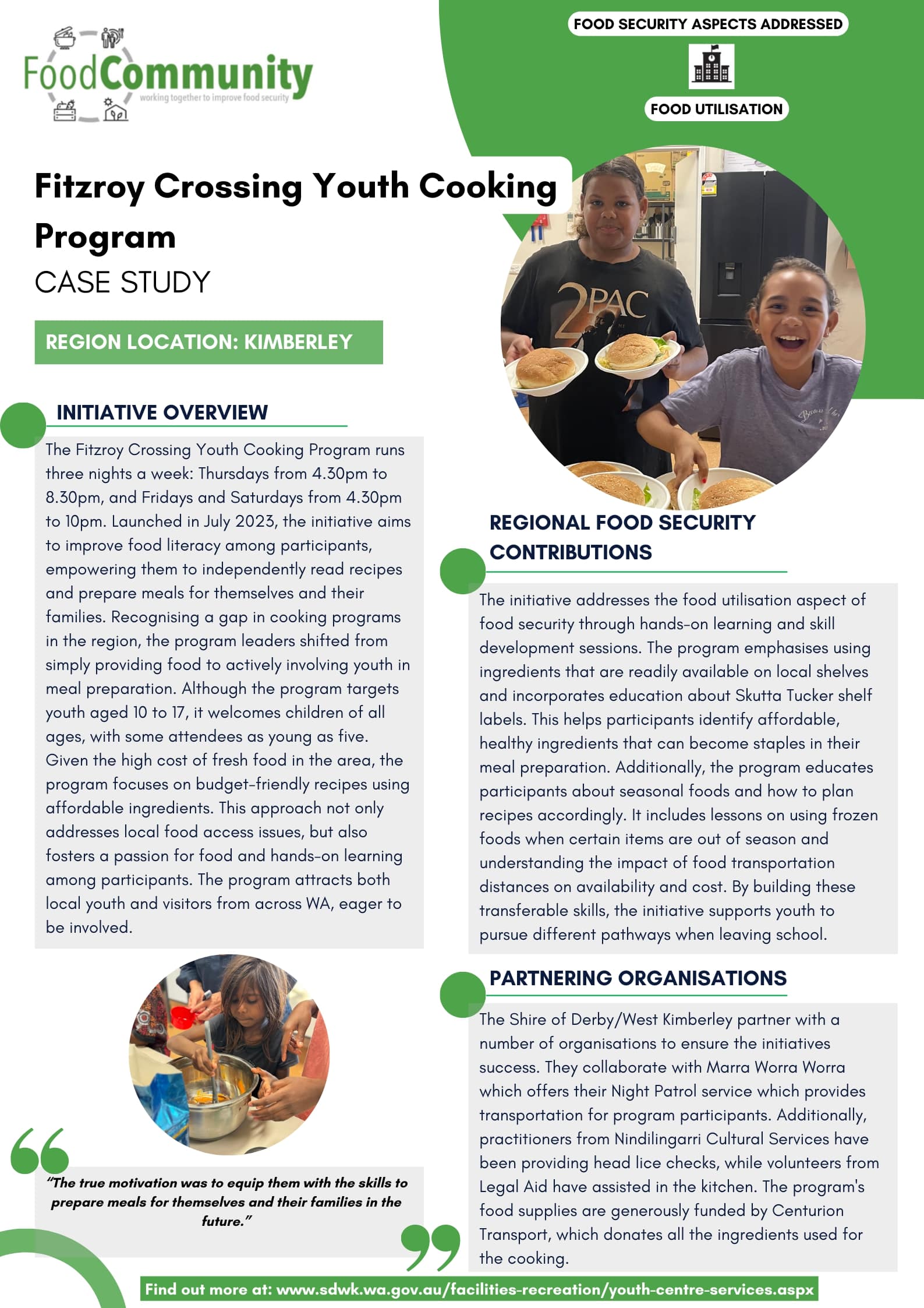 The Fitzroy Crossing Youth Cooking Program aims to improve food literacy among participants, empowering them to independently read recipes and prepare meals for themselves and their families.
