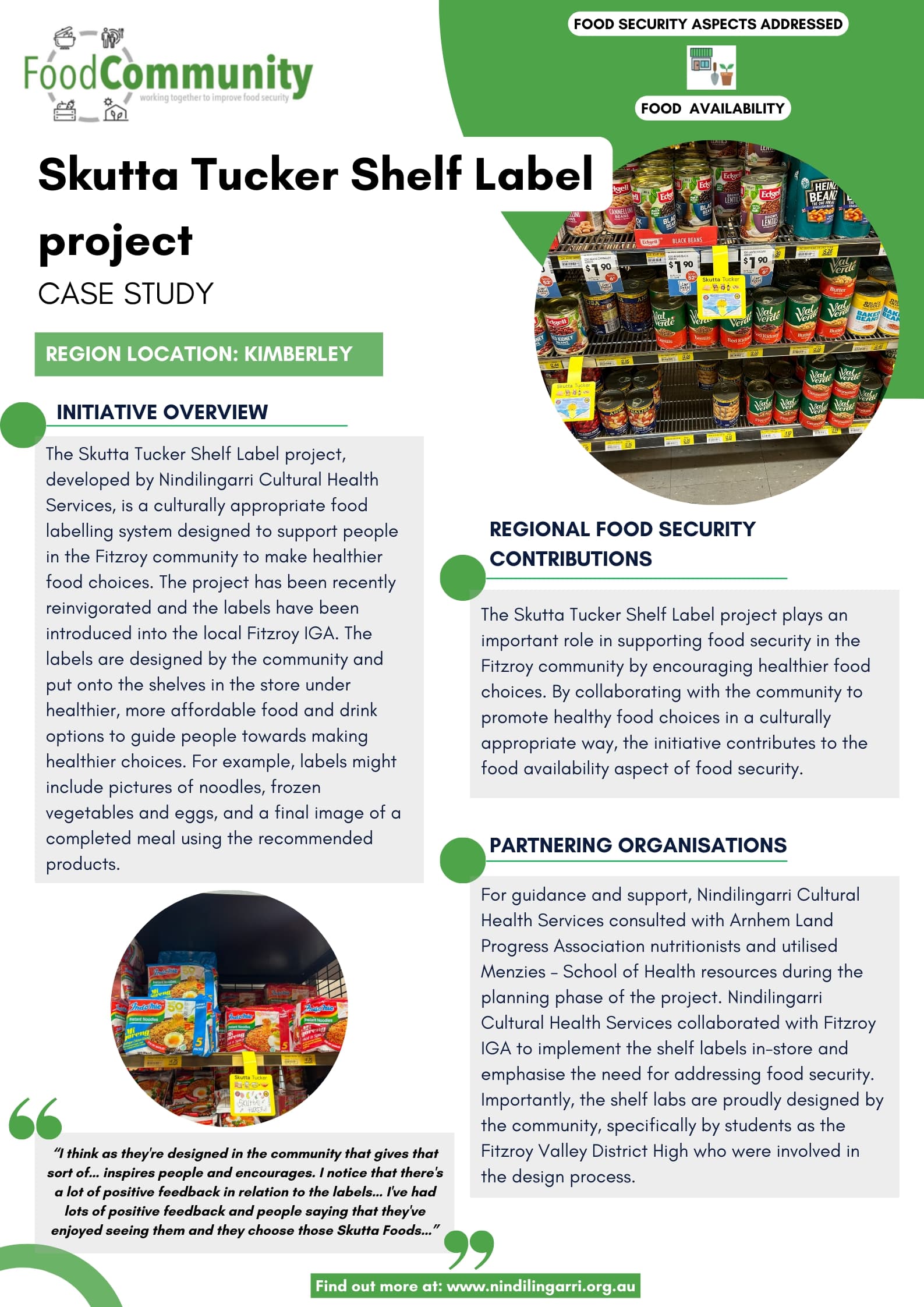 The Skutta Tucker Shelf Label project, developed by Nindilingarri Cultural Health Services, is a culturally appropriate food labelling system designed to support people in the Fitzroy community to make healthier food choices.