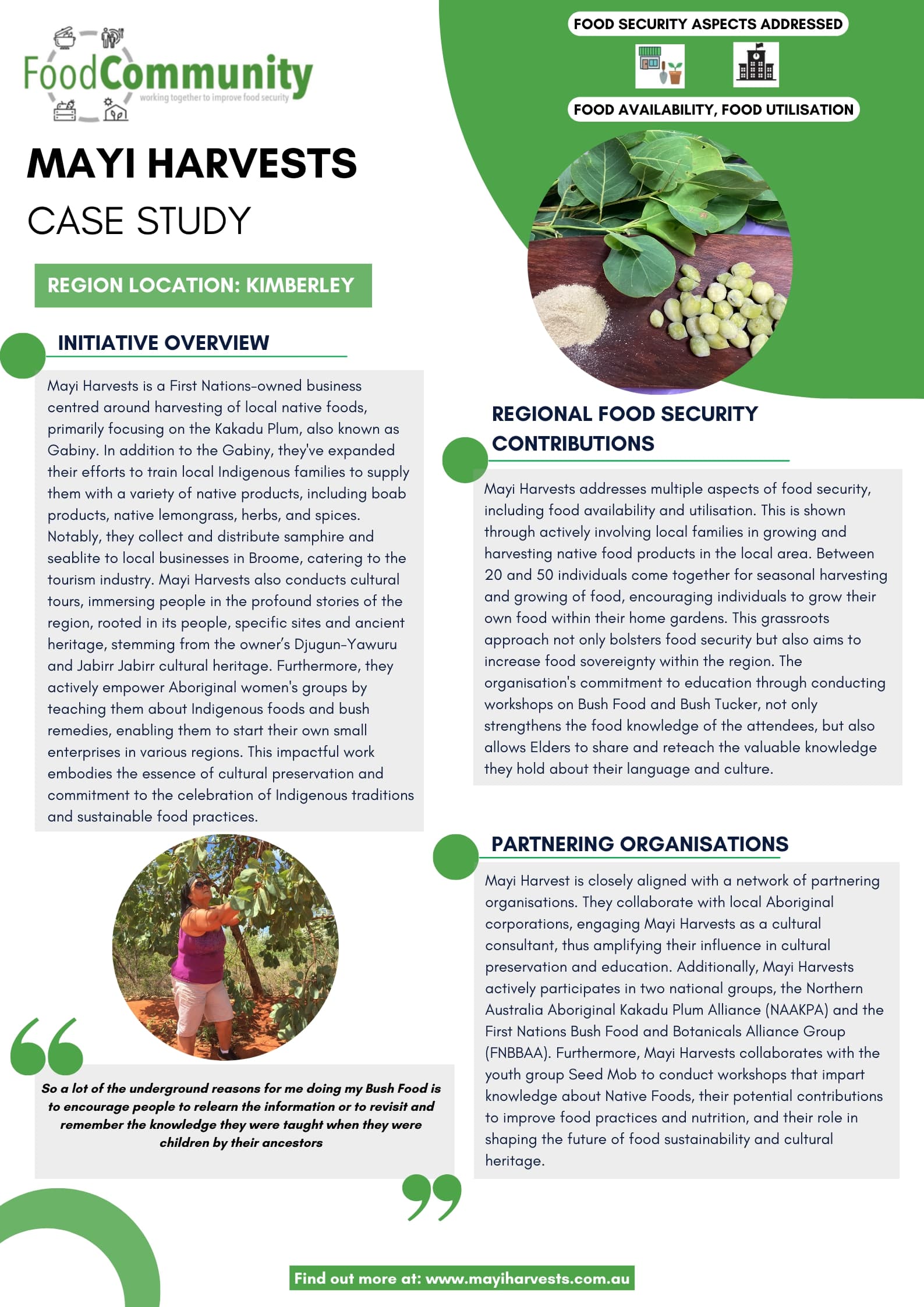 Mayi Harvests is a First Nations-owned business centred around harvesting of local native foods, primarily focusing on the Kakadu Plum, also known as Gabiny.